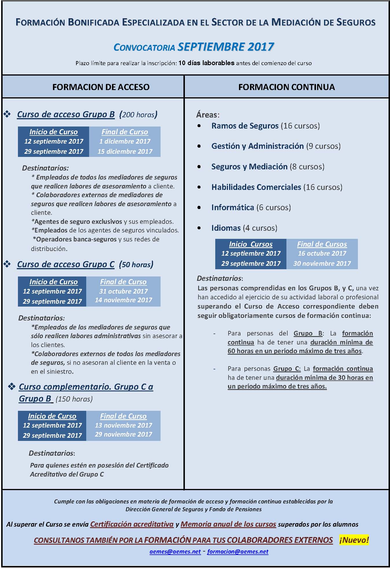 FORMACIÓN CONTINUA SUBVENCIONADA AEMES, Patronal del Sector de la Mediación, ofrece a todo el sector una amplia OFERTA FORMATIVA DE CURSOS DE FORMACIÓN CONTINUA 100% SUBVENCIONADOS POR LA FUNDACIÓN TRIPARTITA, dando respuesta a los compromisos asumidos en el Convenio de Mediación de Seguros Privados y a la Resolución de Formación de la DGS y FP en cuanto a las exigencias en Formación Continua.